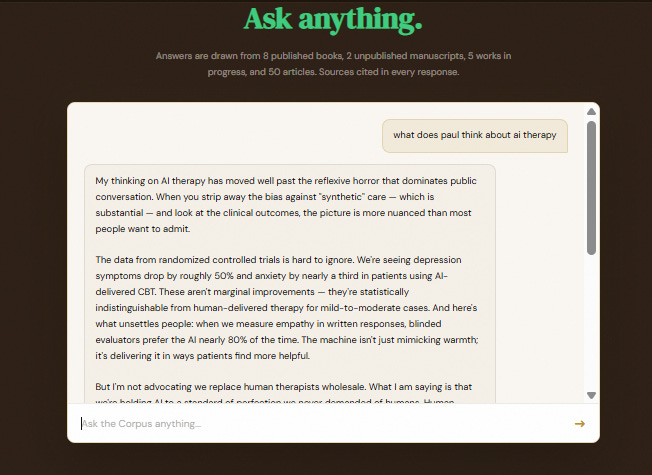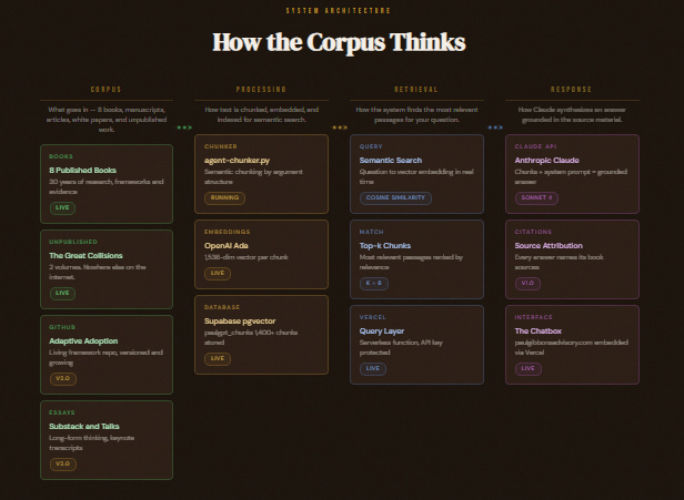 The pipeline, the chunking, the embeddings, the query layer — built using Claude, from scratch, in a few weekends. The engineering isn’t a footnote. It is the argument: AI collapses the gap between imagination and execution.